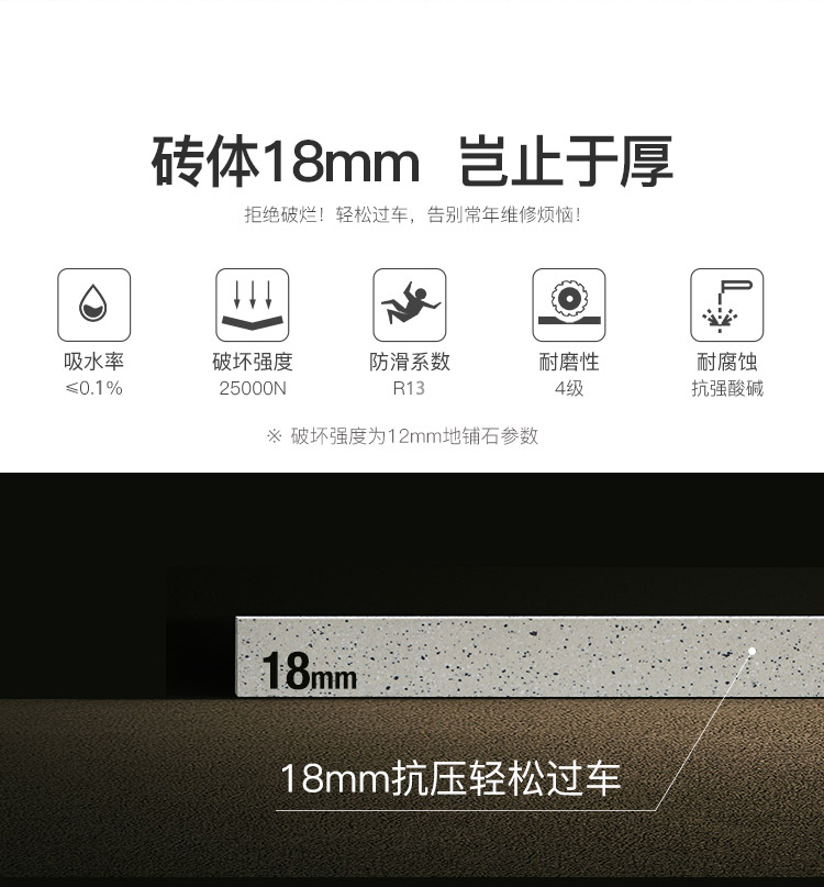 • 產品特性 高硬度高硬度 低吸水率低吸水率 防凍防凍 耐酸堿耐酸堿 防滑防滑 強耐磨強耐磨 低輻射低輻射